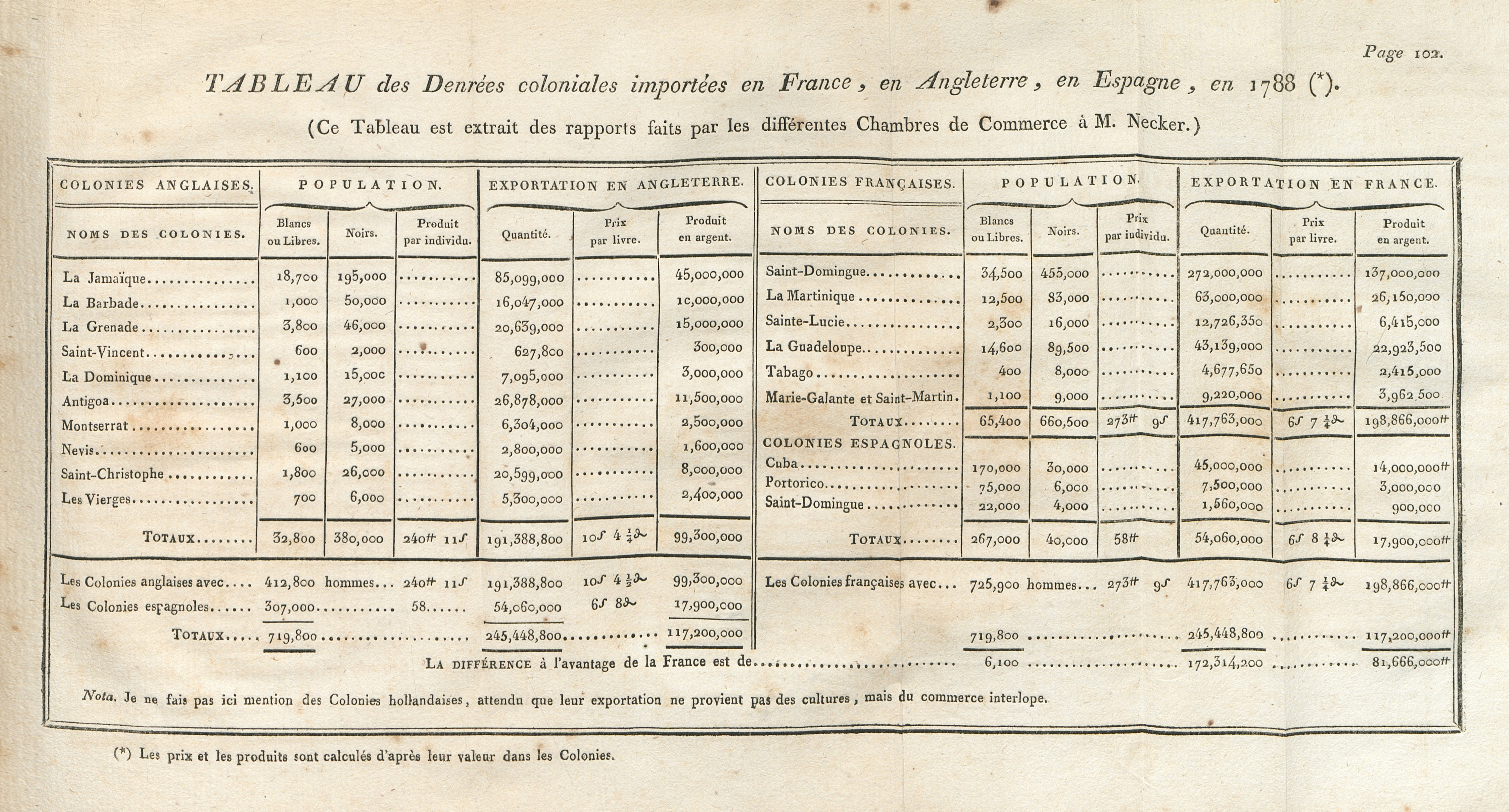 "Tableau des denrées coloniales importées en France, en Angleterre, en Espagne, en 1788 (*). (Ce tableau est extrait des rapports faits par les différentes chambres de commerce à M. Necker.)",