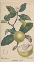Une branche de Mangoustay avec ses feuilles ses fleurs et son fruit.