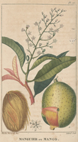 Une branche de Manguier ou Mango avec ses feuilles, ses fleurs et son fruit.