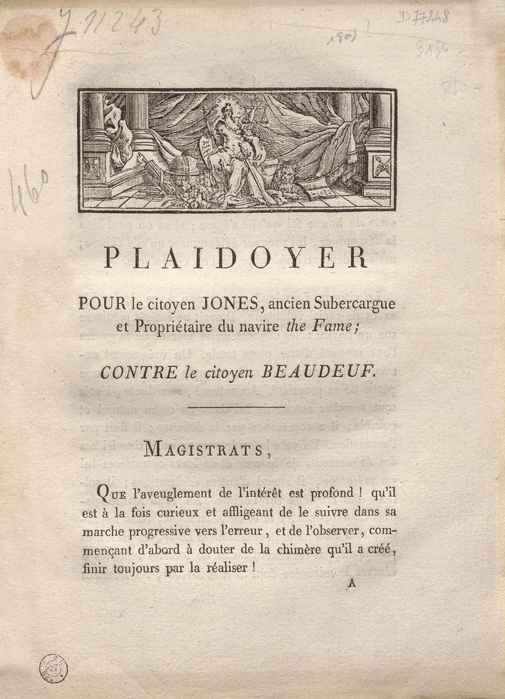 Plaidoyer pour le citoyen Jones, ancien subercargue et propriétaire du navire "the Fame" ; contre le citoyen Beaudeuf