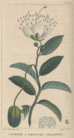 Une branche de Caprier à grosses siliques avec ses feuilles, ses fleurs et son fruit.