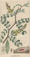 Une branche de Campêche avec ses fleurs et ses feuilles.