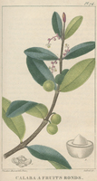 Une branche de Calaba à fruits ronds avec son fruit, ses fleurs et ses feuilles.