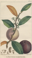 Une branche de Caïmitier pomiforme avec ses fleurs et son fruit.