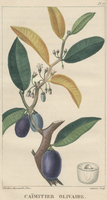 Une branche de Caïmitier olivaire avec ses fleurs et son fruit.