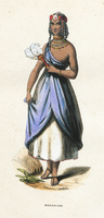 Femme portant dans sa main gauche un éventail à plumes