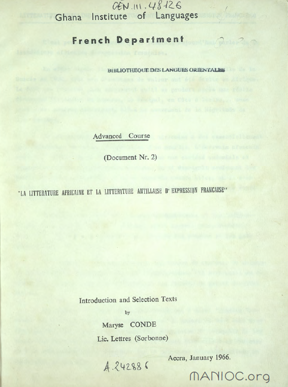Sélection et études de textes de littérature par Maryse Condé, alors enseignante au département de français de l'Institut ghanéen des langues.