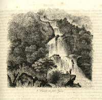 Vignette représentant deux hommes s'apprêtant à traverser la cascade du rio Negro pour rejoindre le bois situé sur l'autre bord