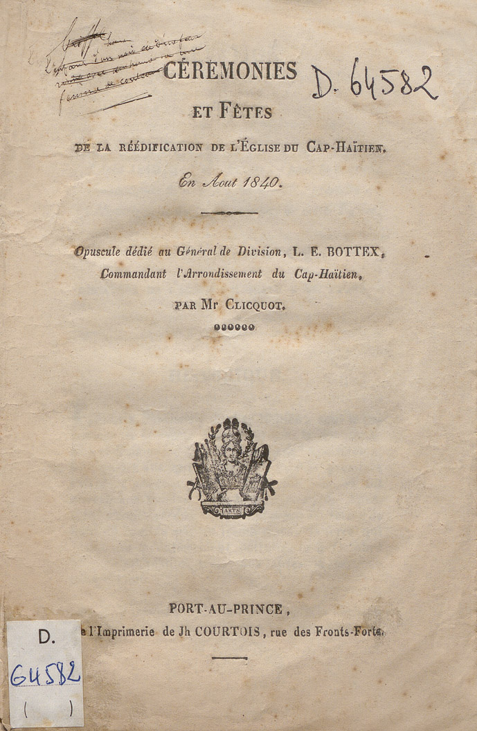 Relation des cérémonies et des fêtes qui ont eu lieu, au mois d'août 1840, au Cap-Haitien, pour la nouvelle consécration de l'Eglise paroissiale précédée de l'historique et de la description de cette église