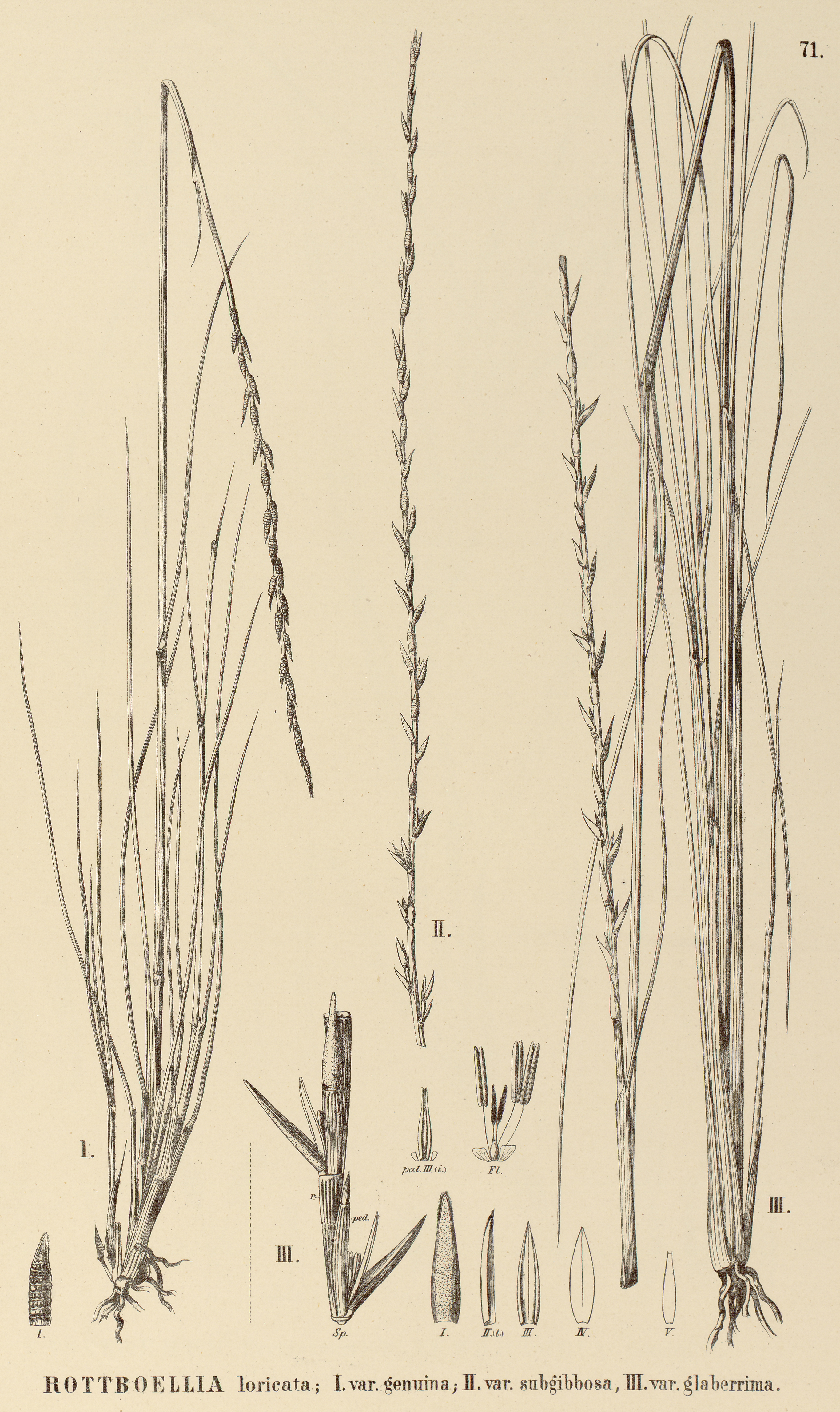 "71. ROTTBOELLIA loricata ; I. var. genuina ; II. var. subgibbosa, III. var. glaberrima.",