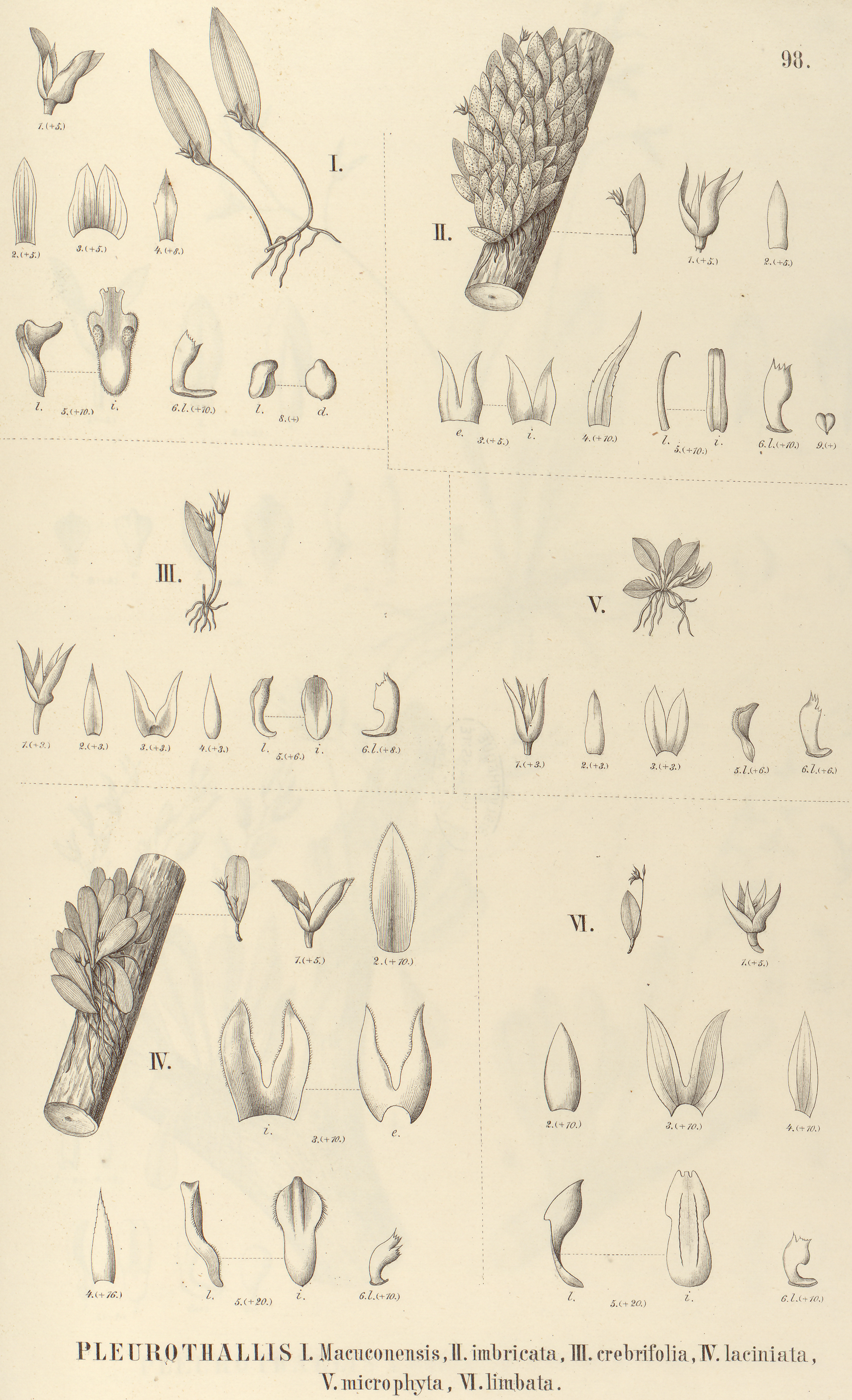 "98. PLEUROTHALLIS I. Macuconensis, II. imbricata, III. crebrifolia, IV. laciniata, V. microphyta, VI. limbata.",