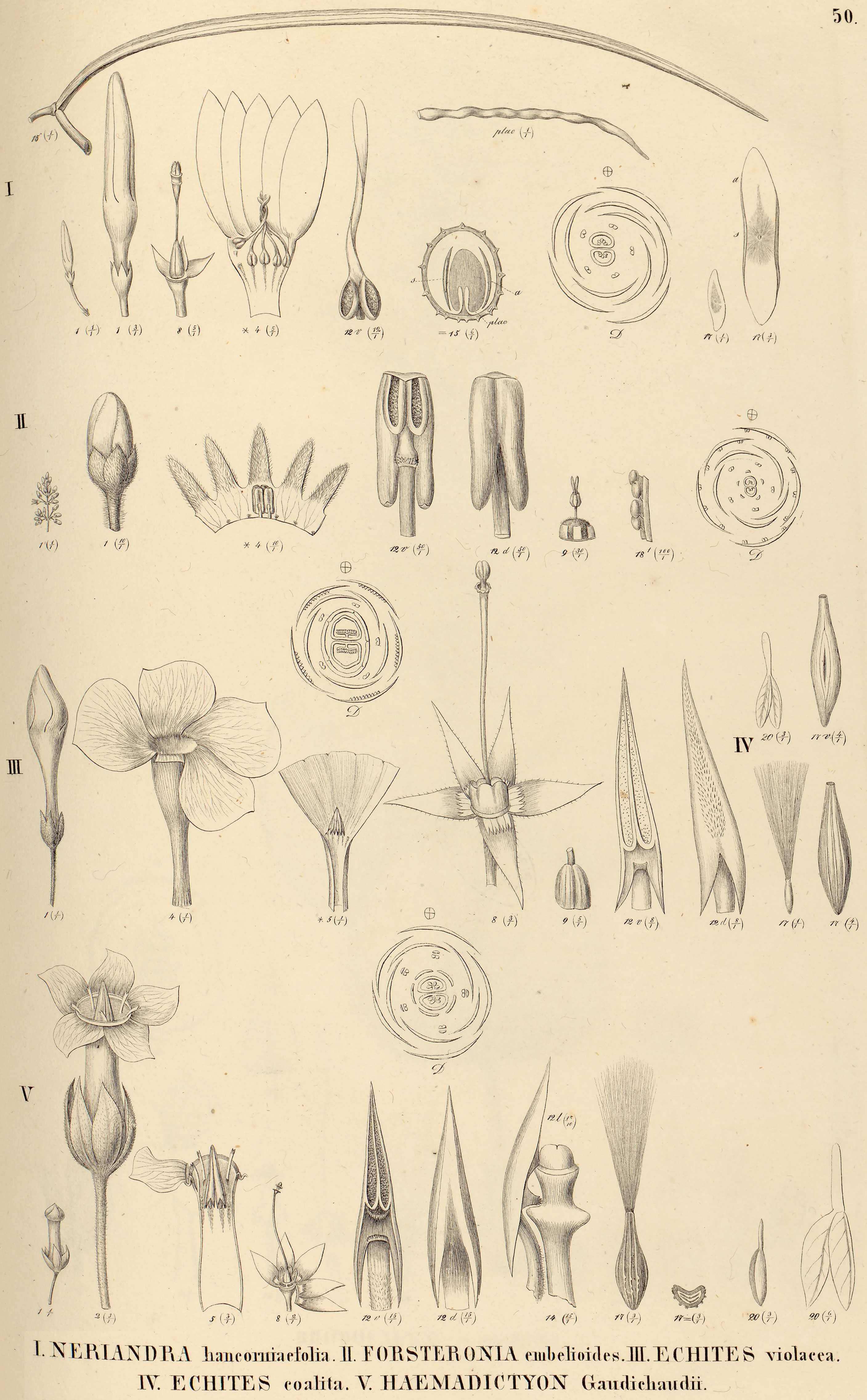 "50. I. NERLANDRA hancorniaefolia. II. FORSTERONIA embelioides. III. ECHITES violacea. IV. ECHITES coalita. V. HAEMAMADICTYON Gaudichaudii.",