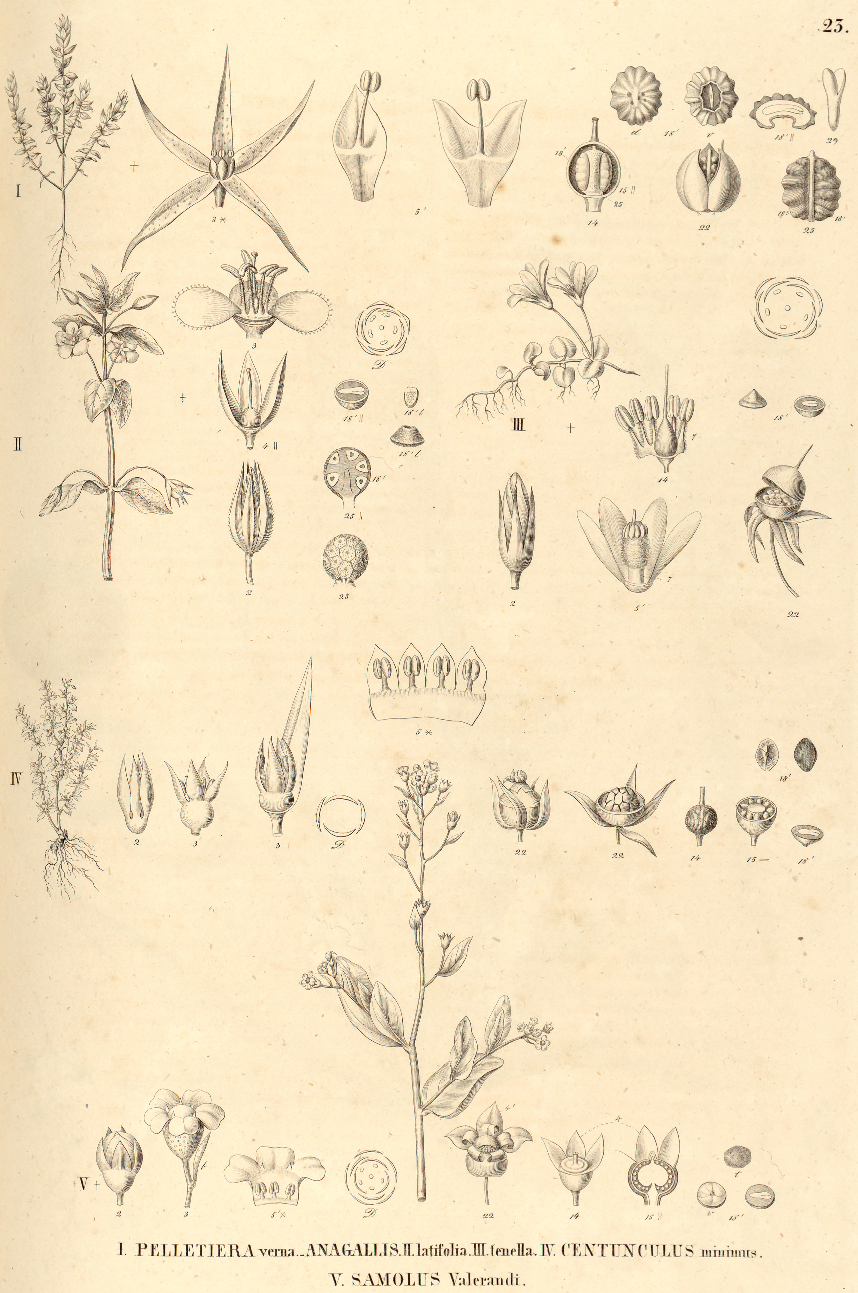 "23. I. PELLETIERA verna. ANAGALLIS. II. latifolia. III. tenella. IV. CENTUNCULUS minimus. V. SAMOLUS Valerandi.",