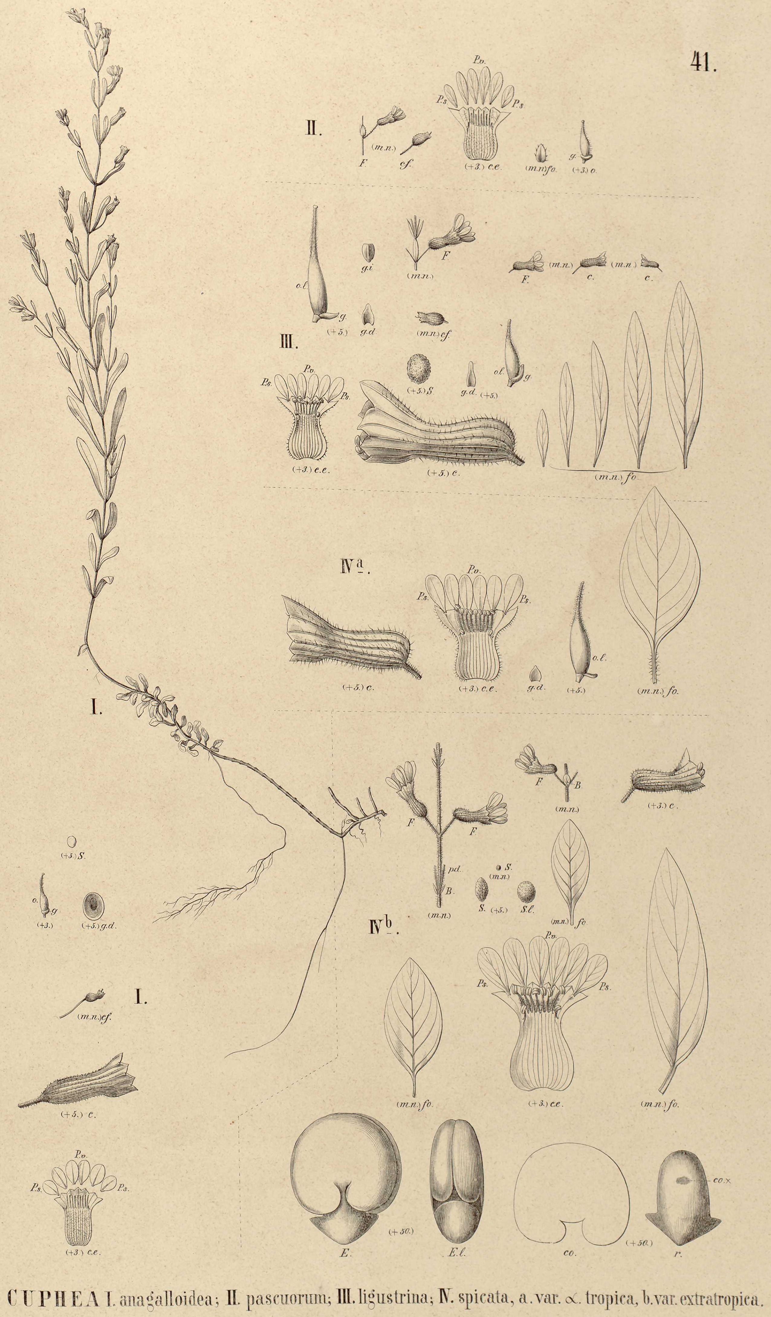 "41. CUPHEA I. anagalloidea; II. pascuorum; III. ligustrina; IV. spicata, a.var. ?. tropica, b.var.extratropica.",