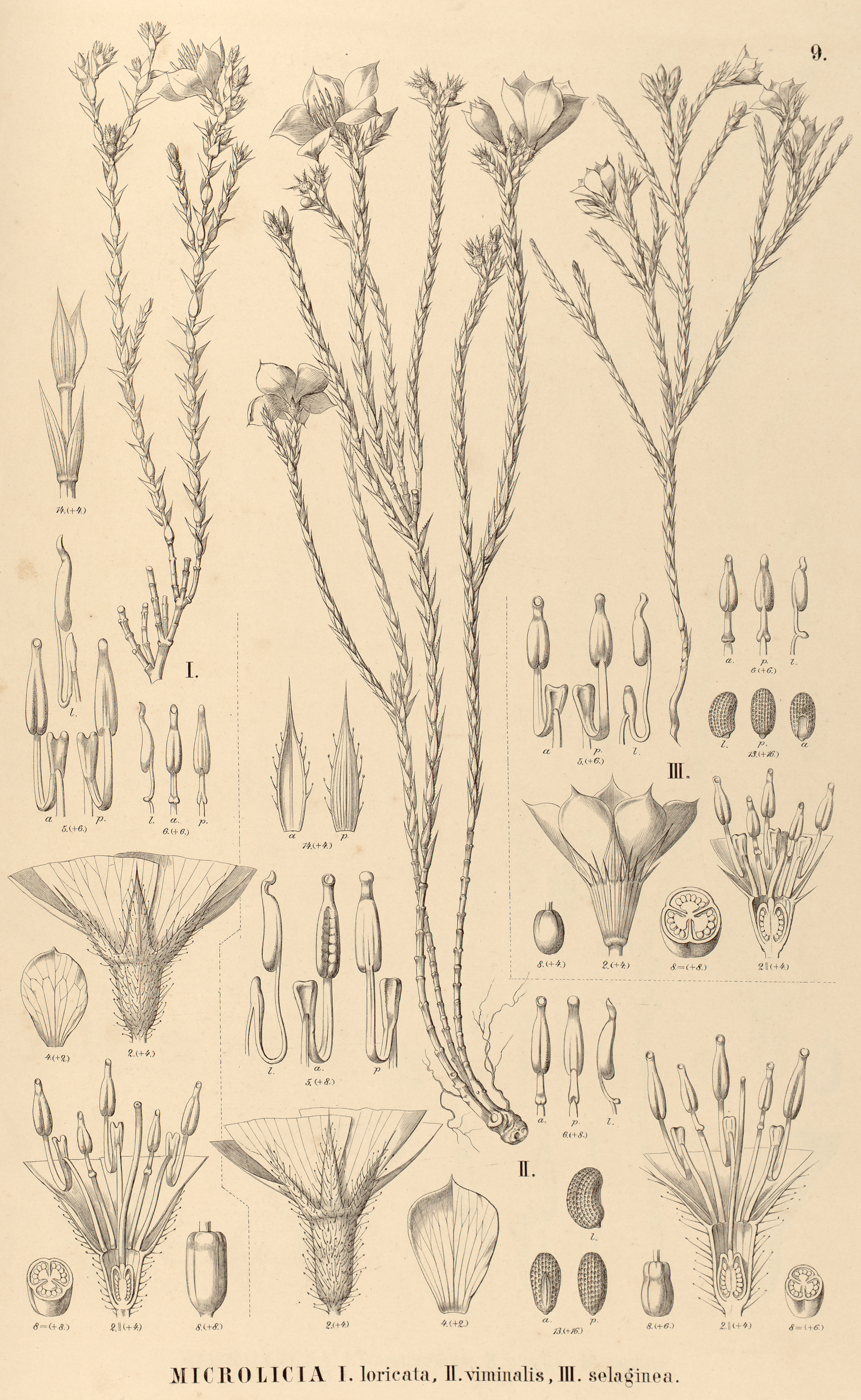 "9. MICROLICIA I. loricata, II. viminalis, III. selaginea.",