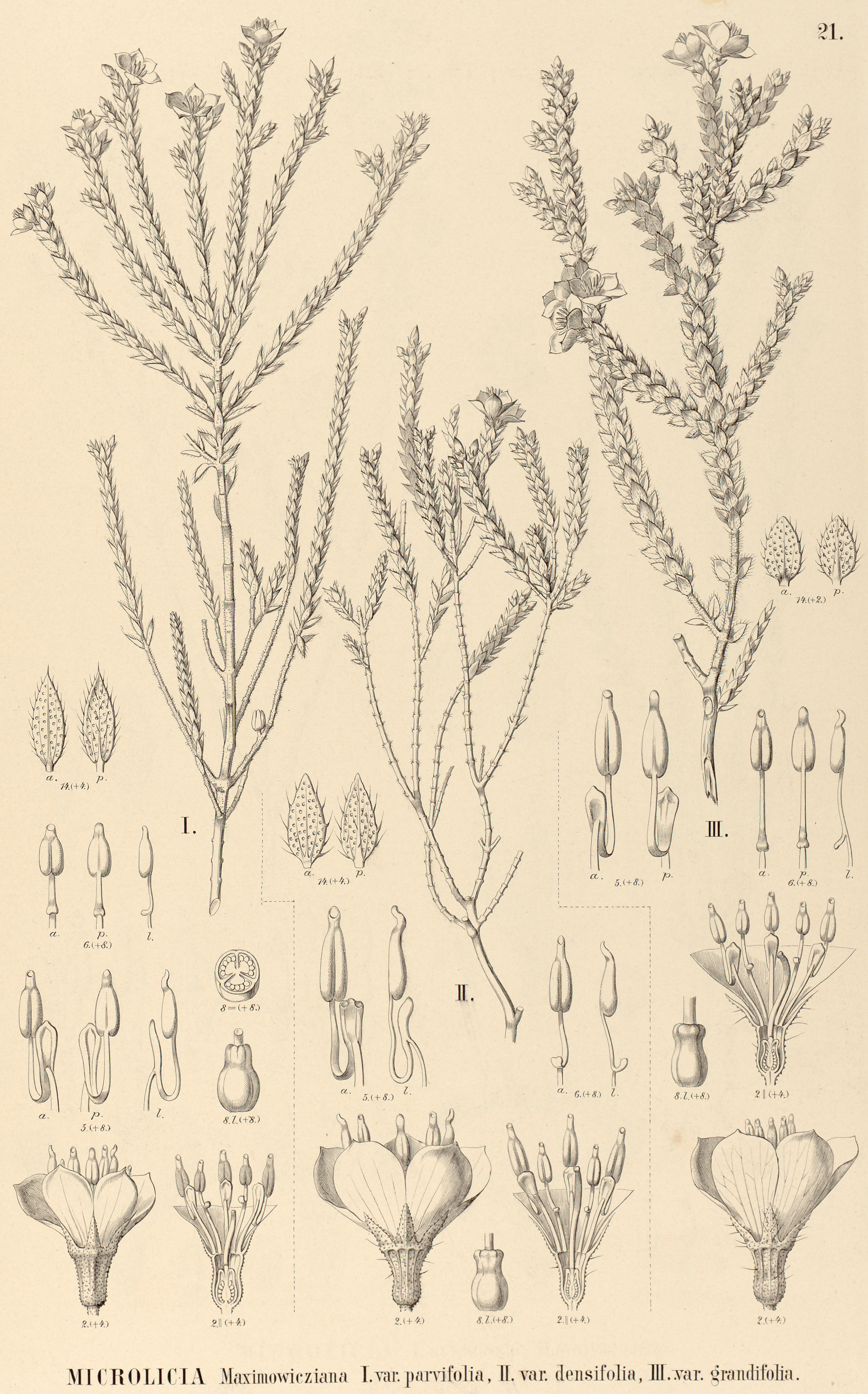 "21. MICROLICIA Maximowicziana I. var. parvifolia, II. var. densifolia, III. var. grandifolia.",