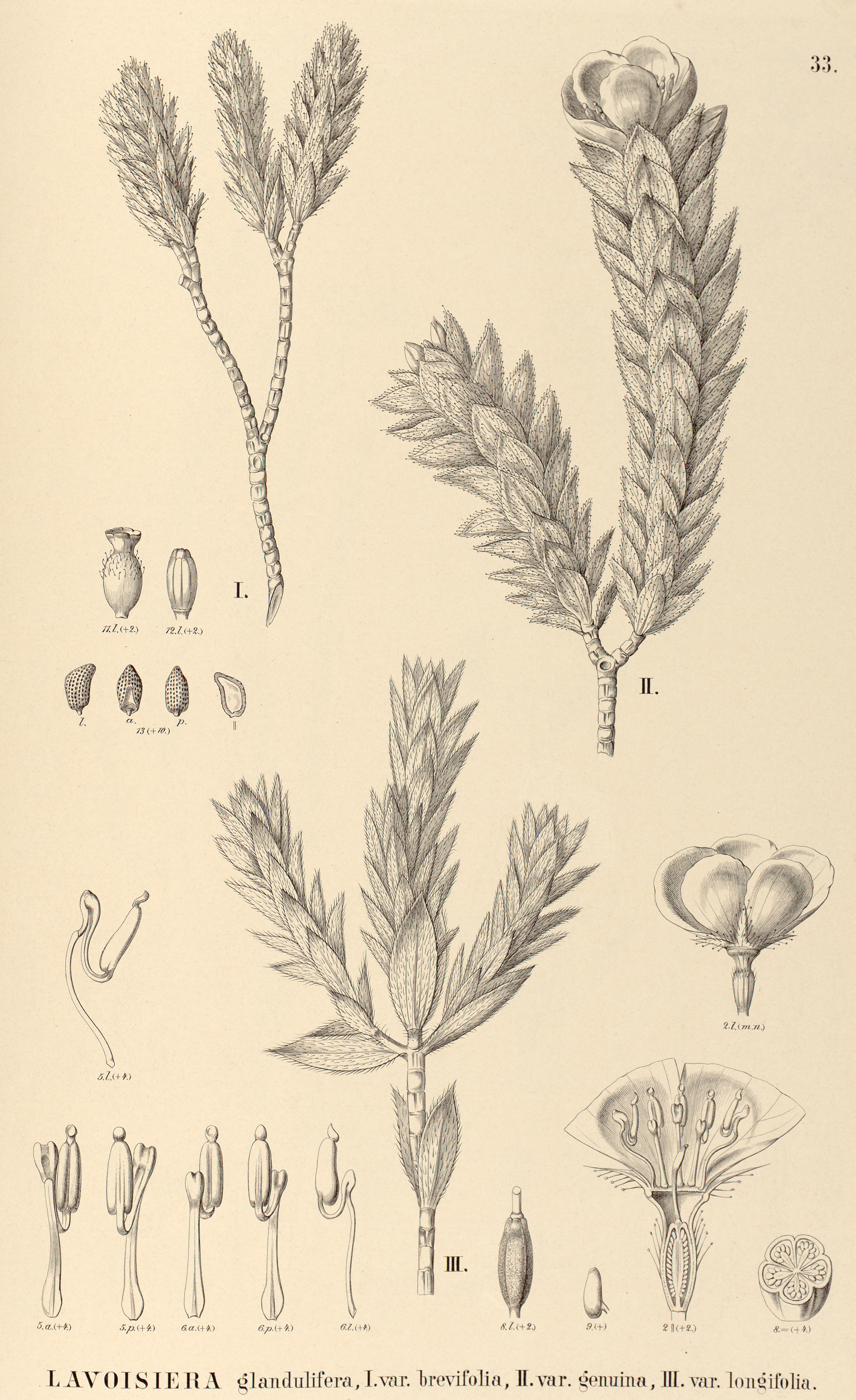 "33. LAVOISIERA glandulifera, I. var. brevifolia, II. var. genuina, III. var. longifolia.",