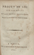 Titre : Projet de loi sur les délits et les peines militairesAuteur : Wimpffen, Félix Louis de (1744-1814)Edition : Imprimerie nationaleLieu : ParisDate : 1791Type : Livre - Loi, texte règlementaire, document officielLangue : FrançaisConditions d'utilisation : Domaine public