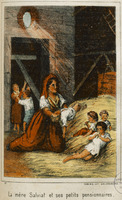 Illustration représentant un bagnard du bagne de Toulon blessé lors d'un travail de chantier et secouru par d'autres bagnards.