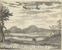 Laïques et religieux européens, en route pour les Indes occidentales ou Amérique, attaqués sur une plage par les habitants de la Guadeloupe.