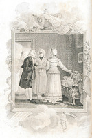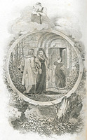 Un médaillon à l'intérieur duquel on voit une femme en tenue d'Eve penchée sur le berceau d'un bébé endormi sous le regard attendri d'un chevalier. Deux oiseaux survolent le médaillon.