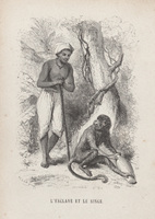 Esclave de type moyen- oriental prés d'un arbre. Le singe tient une amphore