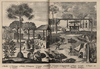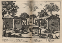 Ménagerie ( Café à Petun. Nègre qui éjambe le petun. Nègre qui le torque. Nègre qui le monte. Nègres qui ratissent le manioc. Moulin à grager le manioc. Ancienne manière de grager le manioc. La presse. Nègre passant la farine. Nègre qui cuit la cassave.La case de maistre. La cuisine. Cassave qui sèche. Corossole )