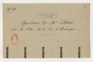Titre : Questions de Louis Choris sur la côte pacifique de l'Amérique du Nord et les îles Hawaï, s.d. (1824) (5 p.) ; questions de D. B. Warden sur les États-Unis pour Charles Joseph Bresson, s.d. (1822-1823) (17 p.) ; questions de Sabin Berthelot, Edme-François Jomard, Georges Lafond et J. B. G. Roux de Rochelle pour le voyage du comte de Castelnau aux États-Unis, 1839 (4 pièces) ; question de Edme-François Jomard pour Louis Choris sur l'Amérique, et plus particulièrement sur le Guatemala et sur le site de Palenque, 1827 (8 p.) ; questions de Edme-François Jomard sur la Californie et sur Palenque pour F. G. Ruger, 1828 (4 p.) ; questions sur la Guyane française pour Leprieur, s.d. (vers 1840) (3 p.) ; questions sur le Brésil par P. Lapie et C. Malte-Brun pour Adrien Louis Cochelet, 1822 (11 p.) : questions générales et sur le Brésil par Louis Claude de Saulces de Freycinet, Jean-Marcel Cadet de Metz, Sébastien Bottin, 1827-1828 (4 pièces) ; questions sur le Haut-Pérou proposées par C. E. Coquebert de Monbret à P. J. B. Vasseur, s.d. (1827 ou 1828) (14 p.) ; questions sur la Bolivie par Sabin Berthelot et J. B. G. Roux de Rochelle, pour A. Charme, 1845-1846 (32 p.) ; questions de C. E. Coquebert de Montbret sur le Chili pour Bertero, 1827 (11 p.)Contributeur : Warden, David Baillie (1778-1845). Auteur du texte , Bresson, Charles Joseph. Auteur du texte , Berthelot, Sabin (1794-1880). Auteur du texte , Jomard, Edme-François (1777-1862). Auteur du texte , Lafond, Georges. Auteur du texte , Roux de Rochelle, Jean-Baptiste-Gaspard (1762-1849). Auteur du texte , Ruger, F. G.. Auteur du texte , Lapie, Pierre (1779-1850). Auteur du texte , Malte-Brun, Conrad (1775-1826). Auteur du texte , Cochelet, Adrien Louis. Destinataire de lettres , Freycinet, Louis de (1779-1842). Auteur du texte , Cadet, Jean-Marcel (1751-1835). Auteur du texte , Bottin, Sébastien (1764-1853). Auteur du texte , Coquebert de Montbret, Charles-Étienne (1755-1831). Auteur du texte , Vasseur, P. J. B.. Destinataire de lettres , Charme, A.. Destinataire de lettres , Bertero, Carlo Luigi Giuseppe (1789-1831). Auteur du texteDate : 1822Type : Document d'archives - archival material, document d'archivesDescription : Appartient à l’ensemble documentaire : MssSGE1Ressources liées : Notice de recueil : http://catalogue.bnf.fr/ark:/12148/cb42409670f, Appartient à : [Questions et réponses aux voyageurs], Notice du catalogue : http://catalogue.bnf.fr/ark:/12148/cb38795351gLangue : freMots-clés : Amérique - Amérique du Nord - Bolivie - Brésil - Californie, État de - Castelnau, Francis de (1812?-1880) -- Voyages - Chili, République du - Guatemala - Guyane, Colonie de la - Hawaii, Royaume indépendant d' - Leprieur, L. J. L. -- Voyages -- Guyane - Palenque (site archéologique) - Pérou - États-UnisConditions d'utilisation : conditions spécifiques d'utilisation (sous convention Société de géographie), restricted use (convention Société de géographie)Notice du document original : Bibliothèque nationale de France, département Société de Géographie, SG COLIS 3 BIS (1628)