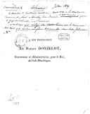 Titre : A son Excellence le Baron Donzelot, Gouverneur et Administrateur, pour le Roi de l'Isle Martinique. 1819Edition : Impr. de Hacquart (Paris)Date : 1819Type : Livre - monographie imprimée, textDescription : Appartient à l’ensemble documentaire : Martiniqu1, Avec mode texteRessources liées : Notice du catalogue : http://catalogue.bnf.fr/ark:/12148/cb34139302dLangue : freConditions d'utilisation : domaine public, public domainNotice du document original : Bibliothèque nationale de France, département Philosophie, histoire, sciences de l'homme, 4-LK12-1188
